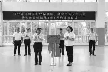 本报济宁6月8日讯(记者 郭纪轩 通讯员 何双胜) 日前,任城区妇幼保健院、济宁市蓝天幼儿园特殊教育学前部(班)签约揭牌仪式在济宁市儿童康复中心举行。济宁市残联理事长张修占、副理事长王正申,任城区残联理事长苏东元,济宁市儿童康复中心副主任孙丹丹,任城区妇幼保健院副院长李延玲、区残疾儿童康复服务中心主任朱绍宁出席仪式。区残联副理事长袁计鹏主持仪式。
