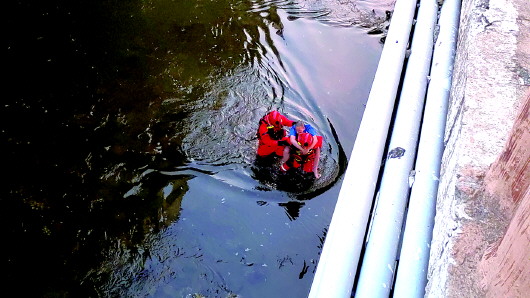 消防救援人员到达现场后,发现此时正在涨潮,两名学生被困在夹河桥下的礁石上。指挥员根据现场情况迅速制订救援方案,选派两名水性较好的消防救援人员在做好安全防护的情况下,着干式水域救援服、激流救生衣,并携带救生圈前往两名学生被困位置。