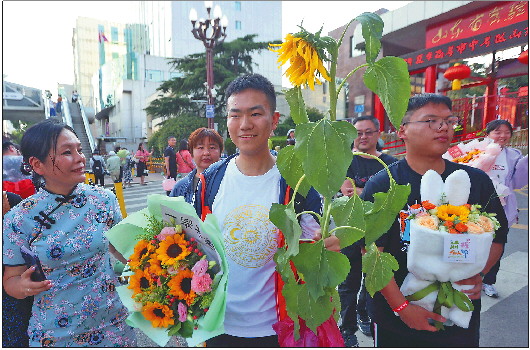 考试结束,这位大男孩(左二)收到了表弟送的向日葵,吸引了不少人的目光。 记者 王鑫 摄