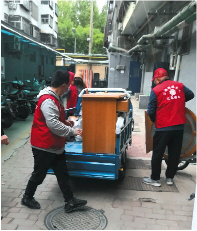 5月31日,在公祥街社区,记者看到3位物业工作人员正在从一处居民楼往外抬废弃的家具,其中一位工作人员表示,他们刚入驻小区一个月,前三个月的主要工作都是卫生攻坚。