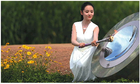 初夏的良渚古城遗址,潺潺流水、呦呦鹿鸣,在大自然声响谱写的原生态交响中,19名身着白色服饰的采火使者缓步登上台阶。“19”寓意第19届亚运会。采火使者手持采火棒,走向采火装置。装置中心是一面凹面镜,外圈采用良渚玉璧造型。采火使者将采火棒伸向采火装置,成功点燃采火棒。