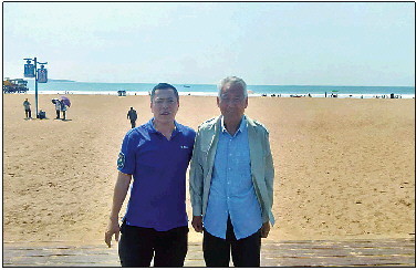 李本强(左)与迷路老人在海边合影。 受访者供图
