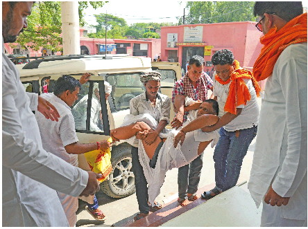 19日,在印度北方邦伯利亚,一名发生中暑症状的老人被送往医院。 新华/美联
