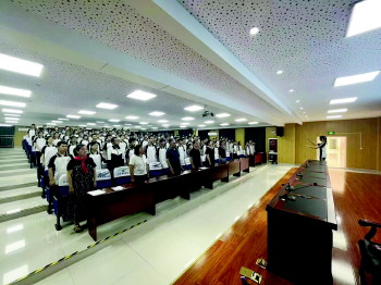 与会领导为新团员佩戴团徽并颁发团员证。胸前闪耀的团徽时刻提醒新团员们努力承担起自己肩负的责任,履行团员义务,用实际行动表明自己无愧于“共青团员”这个光荣称号。