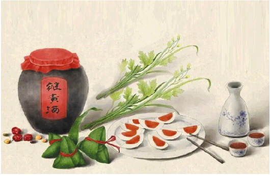俗话说:“五月五,雄黄烧酒过端午。”雄黄是一种可以攻毒、杀虫、止痒的药物,既可以外抹又可以内服,主要用做解毒、杀虫,效果较好。民间将蒲根切细、晒干,拌上少许雄黄,浸白酒,也有单独把雄黄研磨成粉末,放入白酒内泡制成雄黄酒的。