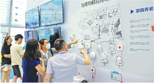6月29日至7月1日,2023中国山东(青岛)国际康养产业博览会在青岛国际会展中心举办。“医养康护”管家式照护模式、智能“中央厨房”、养老驿站……国内外康养机构纷纷亮相,让来宾一站式了解和体验不同类型和特色的养老机构。现场还展出了实木彩虹椅、旋转护理床等适老化产品,微高压氧舱、血糖仪等家庭便民化产品,以及智能康复护理机器人、智能居家养老系统等高科技智能化产品,满足老年人多层次、多样化服务需求。图为参观者在展会上了解智能物联应用场景。 记者 高雅洁 报道 图据新华社