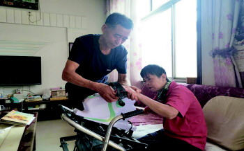 无论春夏秋冬,杨桂之每天五点不到就起来收拾屋子、洗衣服,给妻子按摩、梳头发、穿衣服,还要买菜做饭,帮妻子喂饭、服药。每天晚上,杨桂之至少要起来五六次,帮妻子翻身,伺候妻子大小便等,正是因为杨桂之无微不至的照料,杨金艳从没生过褥疮,身上的衣服也总是清爽干净。每天,杨桂之都要给妻子按摩双腿,进行康复训练,遇到天气晴好温度适宜的日子,杨桂之还会把妻子抱到轮椅上,推着她到村里转转,让妻子看看村里的变化。杨桂之说,照顾妻子虽累,但是他不怕累,“我最怕自己生病,这样就没法照顾好她了。”面对沉重的生活压力,坚强的杨桂之从未说过一个苦字,他下定决心,即使再苦再难,也要竭尽所能把妻子照顾好、把日子过好。