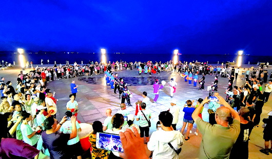 7月6日晚上8点,烟台滨海广场上,急促的鼓点,律动的舞步,吸引了不少附近纳凉的市民围观,一支大秧歌队伍自发在这里表演,精彩的演出引得人群中不时传来阵阵喝彩声与掌声。