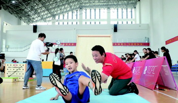 在篮球训练馆室内跑酷、快乐体操项目中,冠军代表帮助学生们进行放松训练,“尽量把双腿并紧”“放松,注意脚下”……他们现场一对一指导学生完成动作,并鼓励学生加强体育锻炼,勇敢地追逐自己的体育梦想。