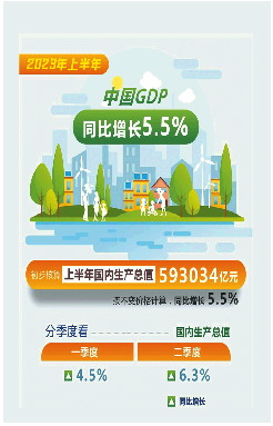 最新数据显示,今年上半年中国国内生产总值(GDP)593034亿元,按不变价格计算,同比增长5.5%。