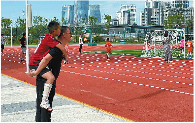 ◥16日,父亲背着儿子胡梓跃来到球场外,望着球场,驻足良久。