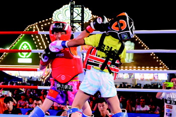 7月16日,在金沙滩啤酒城西啤酒文化广场上,以红蓝白为主色的搏击擂台在数十盏灯光的照射下犹如白昼。