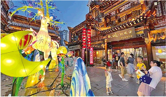 7月23日晚上,在济南大观园,游客们正在花灯下拍照游览。以前的花灯会都在春节和元宵节期间举办,而眼下三伏天里,济南首个夏日花灯游园会亮相大观园。一组组造型多样、璀璨迷人的花灯在夏夜格外亮眼,吸引了众多市民游客驻足欣赏,让人们在纳凉中感受花灯的魅力。 记者 王媛 摄影报道