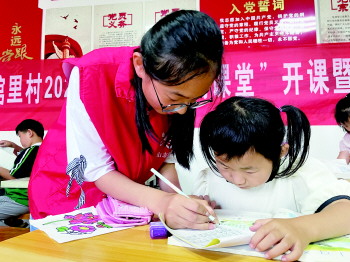 馆里村的三名准大学生报名当起“雏鹰课堂”志愿者。当日,他们在课堂上来回穿梭,辅导孩子学习,还时不时地给他们端茶倒水。除了志愿者,村委会干部也排了班,负责“雏鹰课堂”外围巡逻和安全,预防有孩子偷跑出去玩耍。