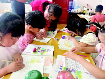 孩子们上课的教室在馆里村老村委会的新时代文明实践站,上课的孩子从幼儿园毕业的到小学一、二年级的都有。上课的方式有些特殊,幼儿园毕业的和一年级的孩子在一间教室,二年级的孩子在另一间教室,孩子们或埋头做作业,或预习新书本。
