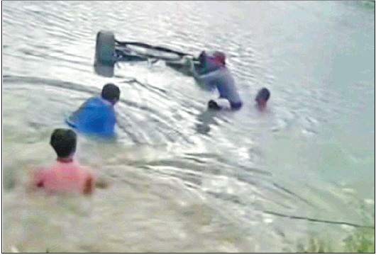 ▲4人先后跳水救人,此时车已经仅剩两个车轮露在水面上。 视频截图