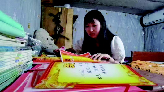 刘香美的房间是小院西侧一间几平方米大的小屋,屋里陈设很简单,一张床加一张桌,奖状和书籍是房间里所有的装饰。