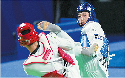 张凯(右)为大运会中国男子跆拳道项目实现了突破。