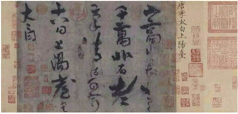 在这段跋语中,宋徽宗提到李白所写的另一件行书《乘兴帖》,徽宗称赞《上阳台帖》和《乘兴帖》一样字迹飘逸,气势雄健,慨叹李白的书法和他的诗一样杰出。《乘兴帖》著录在宋徽宗主编的《宣和书谱》中,《宣和书谱》同时还收录了李白的行书《太华峰》、草书《岁时帖》和《咏酒帖》,可惜这些作品后来都失传了。