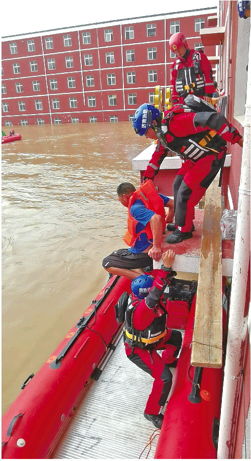“有我们在,你们不要怕!”8月3日上午8时,济南市消防救援支队救援人员曹博源驾驶橡皮艇,向涿州靖雅中学的被困人员喊道。