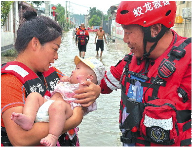 一艘冲锋艇一般只能坐六七人,救援队为了更快转移群众,面对汹涌的暗流,一些水性较好的队员主动下水,尽可能多地让受困群众乘上冲锋艇,用自己的身体驱动船只前行。救援现场,一个婴儿被解救出来,一位女队员小心翼翼地将孩子抱在怀中,一边逗着她,一边蹚水走向安全地带,这温馨的一幕,打动了现场群众。
