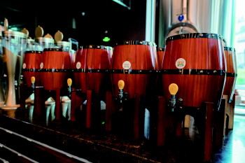 走过啤酒发酵区,便是体验馆的品鉴区。只见工作人员打开其中一个酒头,刚刚酿好的新鲜啤酒就从中汩汩流出,醇香浓厚,深浅不一的酒液犹如各色琥珀,令人垂涎。