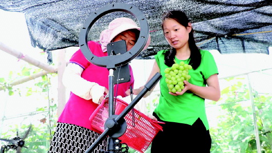 “朋友们,这是我们的葡萄,汁水丰富,口感非常好,欢迎大家来我们大郭庄吃葡萄。”枣庄市孟庄镇大郭庄村90后姑娘牛玲玉正拿着自己亲手种植的“醉金香”葡萄对着直播镜头介绍。