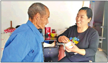 2015年7月份,叔公公因脑梗住院,彭文翠在医院伺候了20多天。叔公公眼睛看不见、手脚不灵活,她一日三餐喂老人吃饭,每隔三个多小时就为叔公公按摩一次。老人牙不好,她就炖软面条、炒鸡蛋、蒸炖鸡蛋羹让叔公公吃得舒心。经过精心照顾和治疗,徐衍和出院后没有留下一点后遗症,手脚灵活,比入院前还胖了一些。