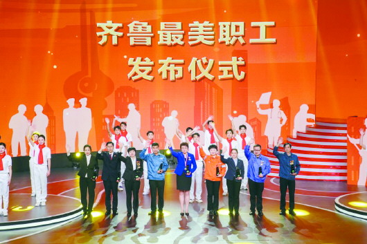 齐鲁最美职工发布仪式,获奖代表上台领奖。