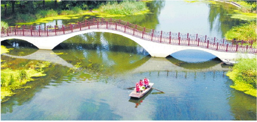 8月15日,在枣庄市峄城区古邵镇湿地公园,志愿者在河面上巡查、清理水面垃圾。“绿水青山就是金山银山”,当天,我们迎来首个全国生态日。生机盎然的中华大地上,天更蓝、地更绿、水更清,万里河山更加多姿多彩。各地纷纷开展活动,提高人们生态文明意识,增强保护环境的自觉性。 新华社发
