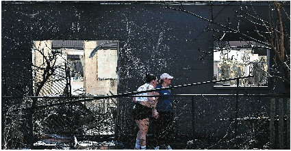 ◥11日,在夏威夷州毛伊岛拉海纳,人们走过被野火烧毁的房屋。