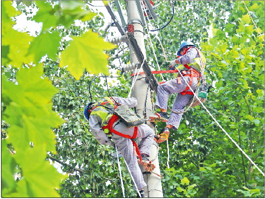 施工人员正在老旧小区供电户表改造现场升级改造供电线路。 何延海 摄