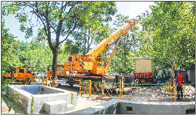 施工人员正在老旧小区供电户表改造现场吊装新的变压器。 何延海 摄