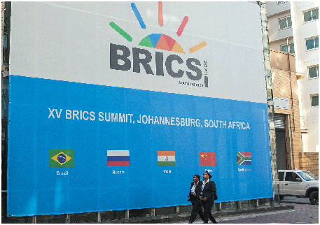 8月21日,在南非约翰内斯堡,行人走过金砖国家领导人会晤举办场所桑顿会展中心。 新华社发