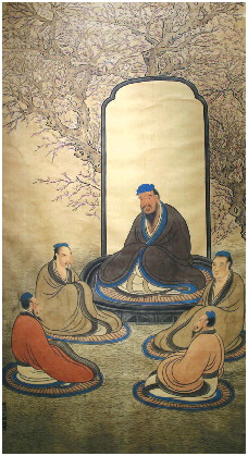 从《孔子杏坛讲学图》中看,四位弟子尽管都是着大领广袖长服,发用蓝布挽髻,但是衣服颜色不同,其中三个弟子穿灰服,一个弟子穿红服。这说明孔子弟子之间的地位和经济状况也不一样。这一点集中体现了孔子“有教无类”的主张,无分贵族与平民,不分国界与华夷,只要有心向学,都可以入学受教。孔子弟子来自鲁国、齐国、晋国、宋国、陈国、蔡国、秦国、楚国,不仅打破了当时的国界,也打破了夷夏之分。比如孔子吸收了被中原人视为“蛮夷之邦”的楚国人公孙龙和秦商入学,还欲居“九夷”施教。孔子弟子中有来自贵族阶层的,如南宫敬叔、司马牛、孟懿子;有来自商人之家的,如子贡;有来自“贱人”家庭的,如冉雍;还有居陋巷的颜回、衣敝缊袍的子路、安贫乐道的原宪等。