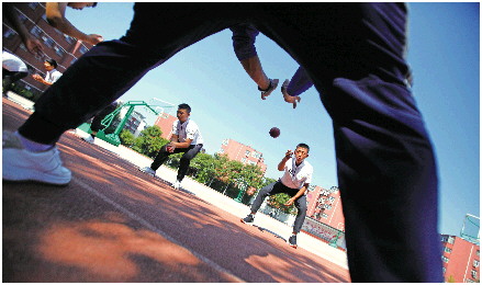 初秋的太阳依然炙热,在济南十六里河中学操场上,身穿队服的孩子们正在进行板球训练,汗水浸湿了他们的队服,在黝黑的皮肤上闪着光。他们全部是该所中学学生。身穿13号队服的是队长马兆吉,今年15岁,前阵子刚刚作为板球特长生专业考试升入高中。