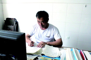 李凤录,学校教导处主任,同时执教九年级化学课,有一个阶段还担任九年级的级部主任,他整日穿行在教学楼和办公楼间,忙碌在学校的教学教研和九年级的教学工作中,去年他在办公楼前卸书时不慎受伤,经鉴定为右足骨折,伤筋动骨一百天,医生建议他卧床休息,作为一名有着近30年教龄的老教师,李主任深谙教师岗位“一个萝卜一个坑”的道理,在家休息两周后就坐不住了,由于右脚踩不了油门,他就骑电动车上下班,医生嘱咐他一个月伤脚不能着地,他就拄着双拐来到学校,踏上他难以割舍的讲台。回到学校后,李主任和往常一样上下班,一如既往的上课、批改作业、补差培优,唯一不同的是拄着双拐。