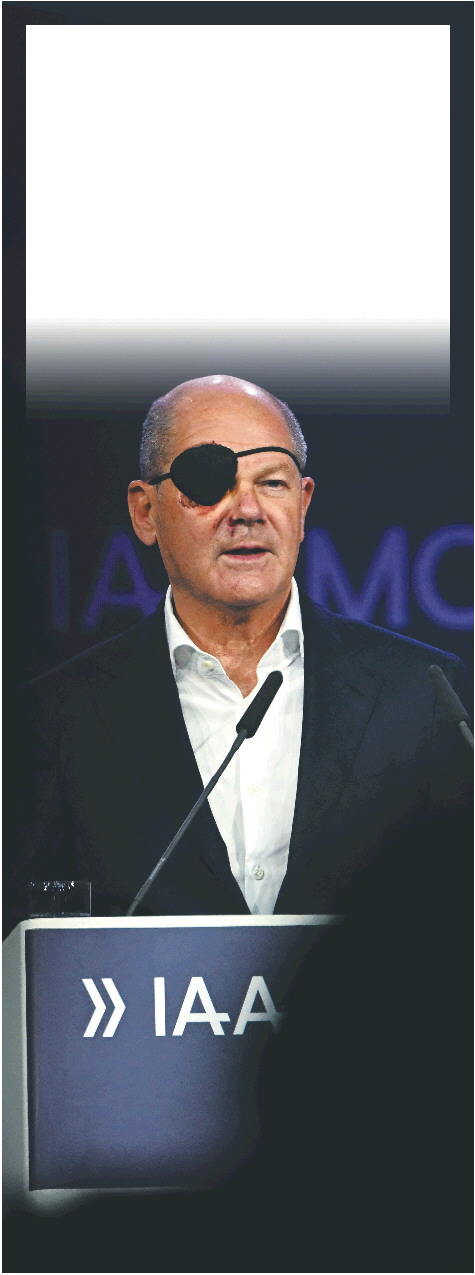 9月5日,德国总理朔尔茨戴着眼罩在慕尼黑国际车展开幕式上发表演讲。 新华/法新
