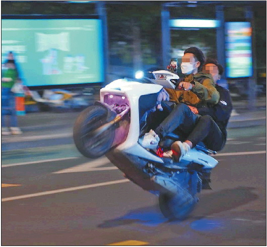 两位“电摩少年”在街头玩“翘头”炫技,动作非常危险。