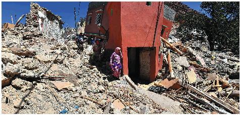 11日,人们在摩洛哥塔鲁丹特附近一村庄震后的废墟上查看。 新华/美联
