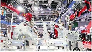 19日,第二十三届中国国际工业博览会上,机器人正在进行车身焊接演示。