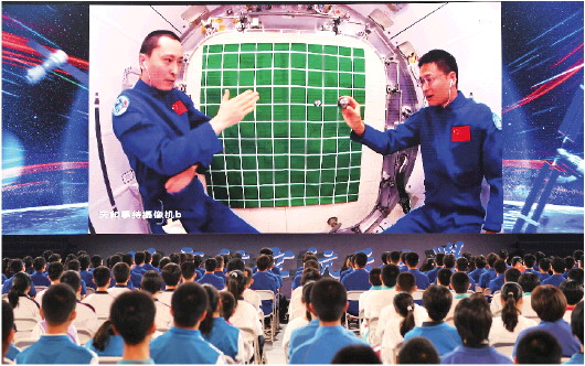 9月21日,“天宫课堂”第四课在中国空间站开讲,神舟十六号航天员景海鹏、朱杨柱、桂海潮授课。本次太空授课继续采取天地互动方式进行,共设立北京航空航天大学等5个地面课堂。“博士乘组”在轨展示介绍中国空间站梦天实验舱工作生活场景,演示球形火焰实验、奇妙“乒乓球”实验、动量守恒实验以及又见陀螺实验,并与地面课堂进行互动交流。图为在北京航空航天大学,学生们观看“太空教师”演示的动量守恒验证实验。 新华社发
