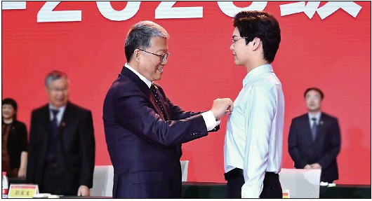 山东大学党委书记郭新立教授为新生代表佩戴校徽。