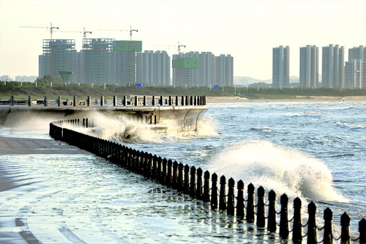 9月20日下午,烟台迎来大风天气,西海岸附近,浪花拍打到岸边激起的水汽被夕阳染成金色,让这座城市有了秋天的意境。 记者 吕奇 摄影报道