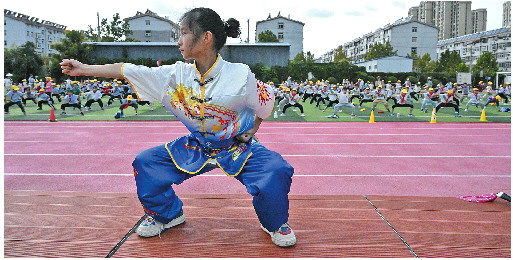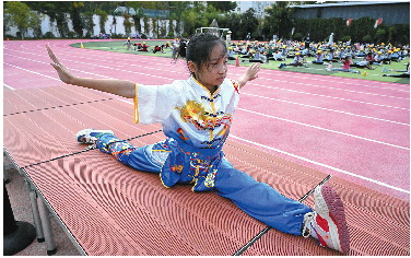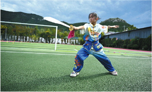 9月20日下午,在济南市市中区爱都小学操场上,鲁俞彤身着武术表演服,手握单刀迎风而舞,一抖腕一甩头,挥刀如行云流水干净利落,旁边的同学一边拍手叫好,一边跟着比划着。