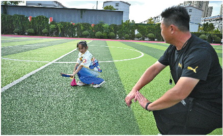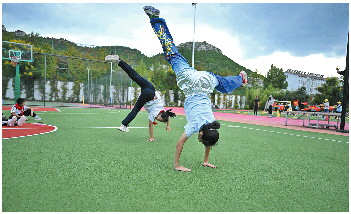 操场上,到处都是孩子们练武的场景,鲁俞彤和同学正在翻跟头。