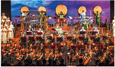 在演出现场,乐队采用三管大型西洋管弦乐队编制,创新性纳入中国传统乐器组成的“雅”乐队,再加上合唱团,复合多元,实现了中西合璧。6个乐章的规模铺陈出宏大的音乐叙事,排箫、编钟、大提琴、小提琴等几十件中、西代表性乐器相契相合,碰撞协奏中,绘出一幅“美美与共、天下大同”的壮丽人文画卷。