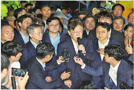 ◥27日,李在明(中)在首尔看守所答记者问。