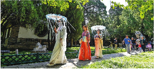 10月5日,游客身着传统服饰行走在山东省青州古城景区。 新华社发