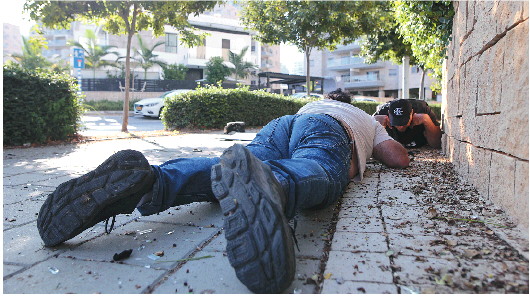 10月7日,在以色列南部城市阿什克隆,民众匍匐在地躲避火箭弹袭击伤害。 新华社发